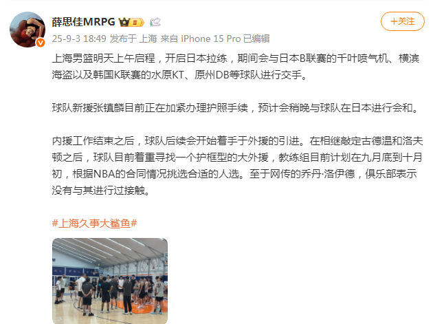 北京时间9月3日,上海男篮在完成国内球员注册后,如今根据《东方体育日报》记者薛思佳报道,上海男篮将在9月4日上午启程去日本,新援张镇麟正在加紧办理护照手续,预计稍晚与球队会合,而球队并未与乔丹-洛伊德接触。